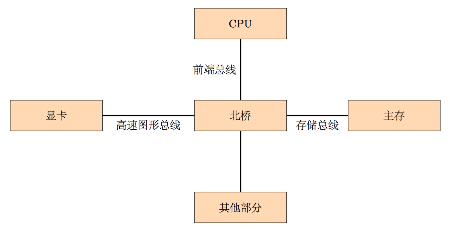 后来,CPU 的频率提升很多,而内存的频率跟不上 CPU 的频率。于是 CPU 开始采用倍频的方式与总线通信——也就是说,CPU 跑过多个时钟周期,再一股脑跟总线通信;就好像总司令连着颁布几道命令,通讯员一口气把这些命令下达到前线一样。与此同时,图形化操作系统(Windows)和 3D 游戏迅速发展起来,这就要求显卡能与 CPU 和内存之间进行大量的数据交换。于是,人们专门设计了一个北桥芯片(Northbridge, PCI Bridge),用来协调 CPU、内存和显卡之间的高速内存交换。