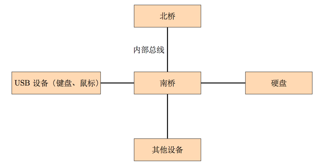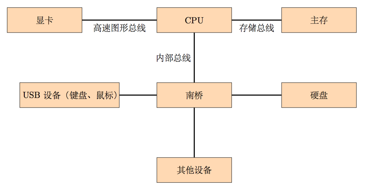 后来,随着处理器制造技术的提升,北桥被 CPU 直接集成在内,形成了类似下图的结构。