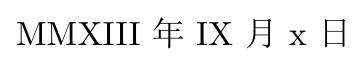 |  \documentclass{ctexart} \newcommand*{\rmn}[1]{\romannumeral#1} \newcommand*{\RMN}[1]{\uppercase\expandafter{\romannumeral#1}} \begin{document} \RMN{2013}年\RMN{9}月\rmn{10}日 \end{document}