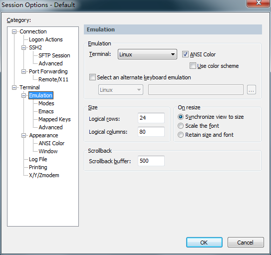 按照图示,将 Terminal 模式选择 Linux,同时勾选 ANSI Color。