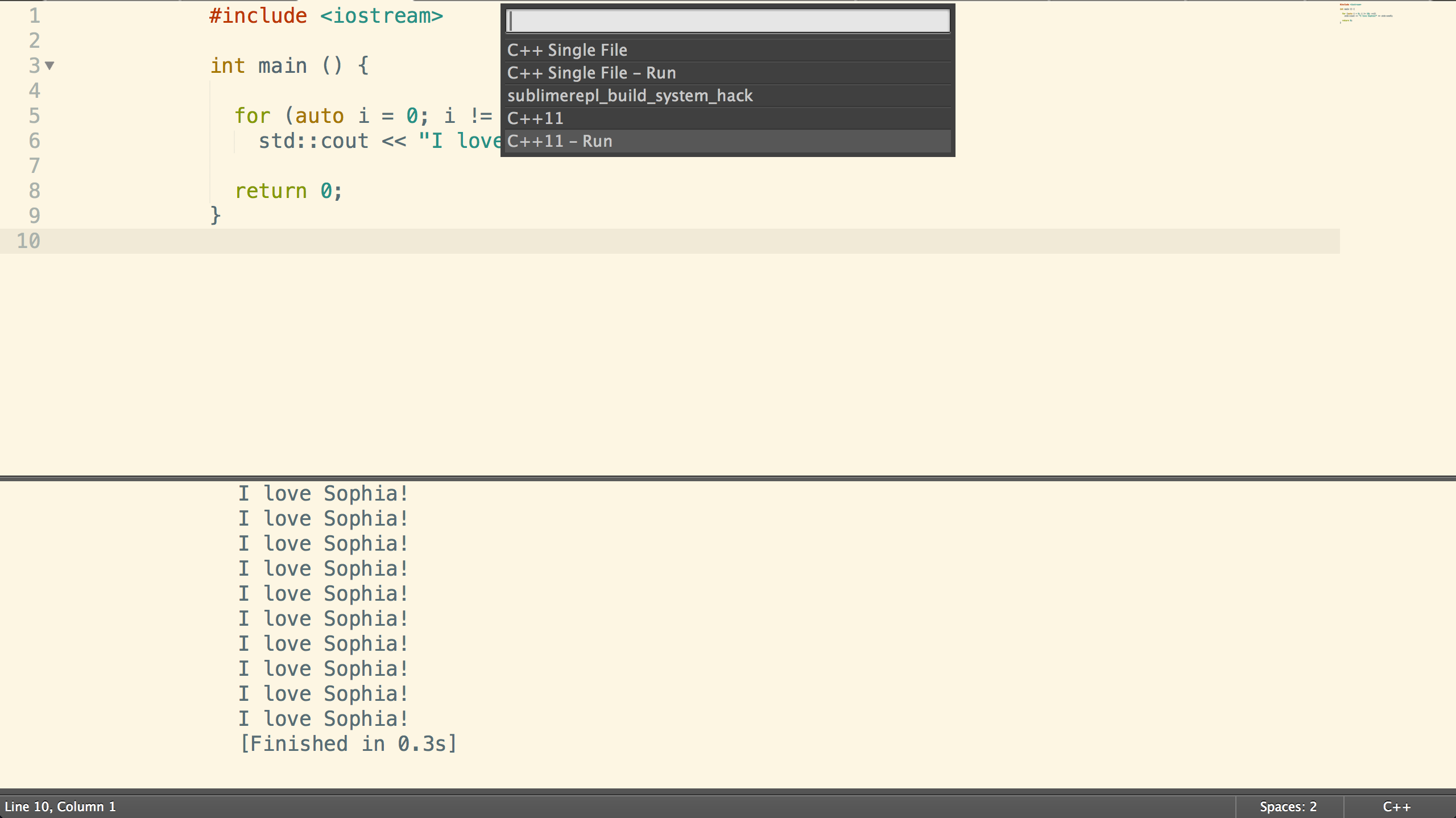 将其保存为 /Users/<USERNAME>/Library/Application Support/Sublime Text 3/Packages/User/C++11.sublime-build。