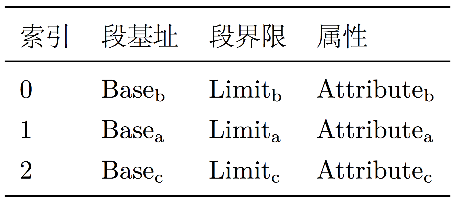 如果我们把描述符中的内容,简单划分为三部分:段基址(Base)、段界限(Limit)和属性(Attribute),那么段表大致可以用下图所示的表格表示。