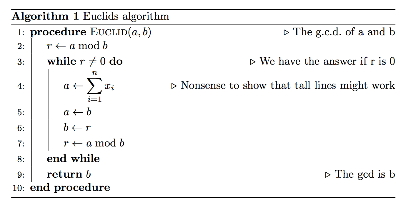 这里,我们调用了 algorithm 宏包,它提供了 algorithm 环境。这是一个三线表样式的浮动体,浮动的策略和 LaTeX 标准的 figure、table 环境一致。algpseudocode 宏包则是 algorithmicx 宏包的一部分,它提供了实际用来排版伪代码的环境。