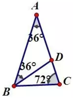 过 $B$ 做 $\angle ABC$ 的角平分线,与边 $CA$ 交于点 $D$。如此,图中有 3 个等腰三角形:$\triangle ABC$, $\triangle BCD$, $\triangle DAB$。并且,显而易见地有 $\triangle ABC \sim \triangle BCD$。