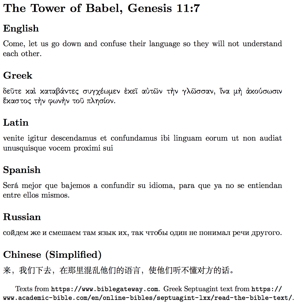1 2 3 4 5 6 7 8 9 10 11 12 13 14 15 16 17 18 19 20 21 22 23 24 25 26 27 28 29 30 31 32 33 34 35 36 37 \documentclass {article}\usepackage {hyperref}\usepackage {fontspec}\setmainfont {CMU Serif}\usepackage {xeCJK}\begin {document}\section *{The Tower of Babel, Genesis 11:7}\subsection *{English}Come, let us go down and confuse their language so they will not understand each other. \subsection *{Greek}δεῦτε καὶ καταβάντες συγχέωμεν ἐκεῖ αὐτῶν τὴν γλῶσσαν, ἵνα μὴ ἀκούσωσιν ἕκαστος τὴν φωνὴν τοῦ πλησίον. \subsection *{Latin}venite igitur descendamus et confundamus ibi linguam eorum ut non audiat unusquisque vocem proximi sui \subsection *{Spanish}Será mejor que bajemos a confundir su idioma, para que ya no se entiendan entre ellos mismos. \subsection *{Russian}сойдем же и смешаем там язык их, так чтобы один не понимал речи другого. \subsection *{Chinese (Simplified)}来,我们下去,在那里混乱他们的语言,使他们听不懂对方的话。 \bigskip \small Texts from \url {https://www.biblegateway.com }. Greek Septuagint text from \url {https://www.academic-bible.com/en/online-bibles/septuagint-lxx/read-the-bible-text/ }. \end {document}