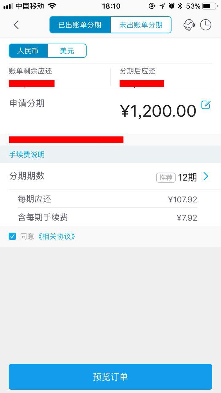 为方便对比,我们仍以 1,200 为例。以下是我尝试在招商银行掌上生活 App 中为 1,200 元进行 12 期信用卡分期付款的截屏。