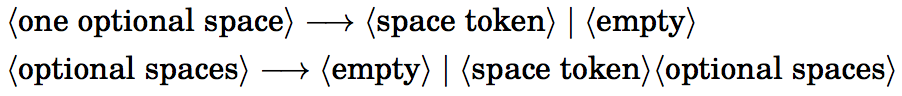 在状态 N 和状态 S 中,不论字符编码是多少,空格记号—— 分类码为 10 的记号 —— 都会被忽略;同时 TeX 的状态保持不变。在状态 M 中,TeX 会向正在构建的记号序列中插入 ␣(类别码为 10),并进入状态 S。这意味着空格记号的字符编码可能与输入字符的编码不同。