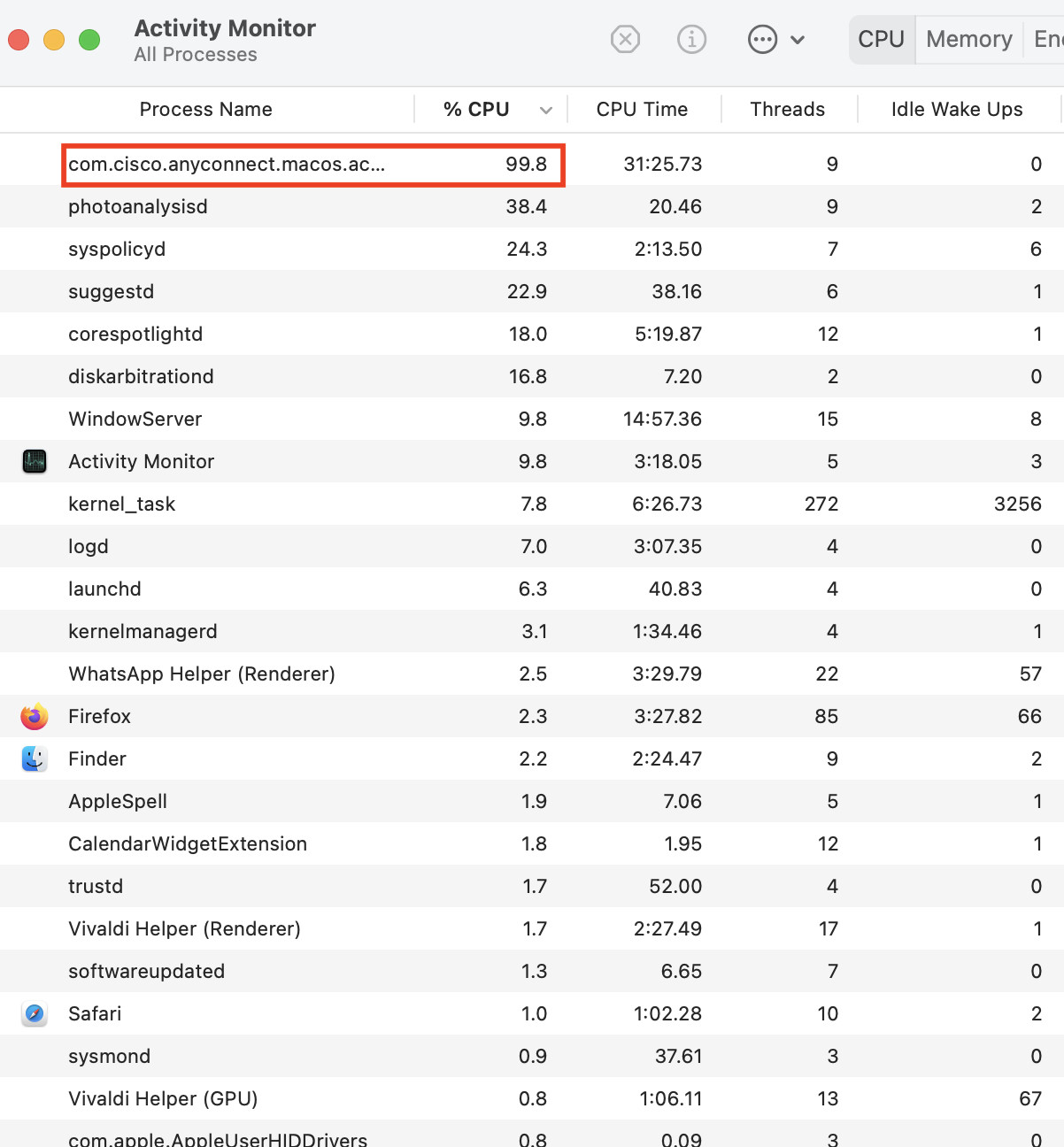 最近将 Cisco AnyConnect 升级到了公司提供的 4.10.00093 版本。接下来就发现 cisco.anyconnect.macos.acsockext 长期大量占用 CPU 资源,以及导致风扇转动不停。这显然是个问题。